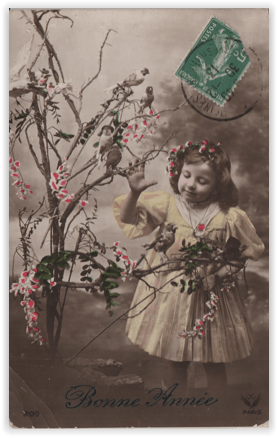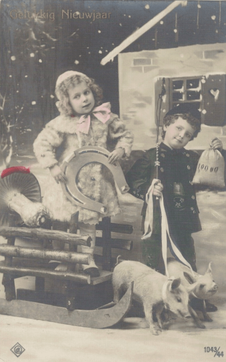 The Germans preferred to pose their little girls with pigs, of course. And they did not neglect dressing up little boys, either. (Those pig new year cards were traditional across the continent, by the way, and though I haven’t got an example to hand, little boys AND little girls would be dressed up as chimney sweeps to accompany the pigs. See, it was all about symbols of good luck and…you want to go back and check the previous blog on this subject.)