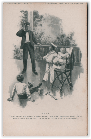 We have discussed theft before, as with the young lady swiping sweets or this lad who knows where his sister keeps her mad money. This is a constant theme: children were EXPECTED to steal fruit (often unripe, leading to a different postcard theme) or jam or pie. (Oddly enough, stealing cookies—a standard gag in comic strips from the 1950s on, seems to be absent. Was it a rarer crime in those days than jam-stealing or just harder to draw?)