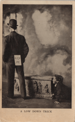 We wish here to look at postcards which consider the child as someone who deliberately does something antisocial, or at least something in contradiction to parental rules. There are plenty of postcards like the one shown here, where children are engaged in things that shock a parent because they just didn’t know any better. That’s not what we’re after here.