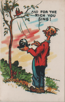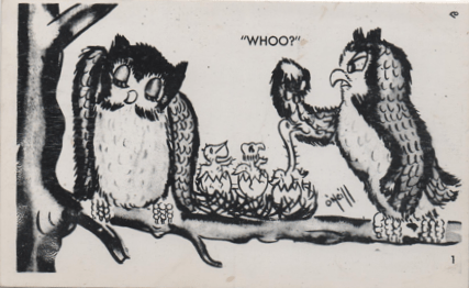 We have been going through my inventory looking at birds which are not storks or chickens, which seem to be out most popular postcard avians. We have covered such obvious choices as vultures and ostriches, and looked briefly into the postcard lives of pelicans, ducks, and geese. For reasons not known to me, I have found no cartoon woodpeckers in my files (sorry, Woody) while flamingos, a postcard staple, are valued manly for their decorative qualities, and almost never appear in cartoon postcards.