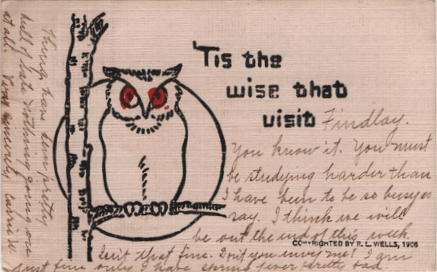 Meanwhile, in another part of the forest, we have the owl, who had three basic purposes on postcards. As mentioned here and there, I have virtually no Halloween postcards. On Halloween, an owl’s function was closest to its role in real life and folklore: terrifying apex predator. But the rest of the year, it weas usually a symbol of wisdom (a result of its large eyes and tendency to stand there watching you with apparent disapproval. The ancient Greeks made the owl a sidekick of Athena, Goddess of Wisdom, essentially for its face alone.