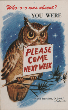 We mentioned a few weeks ago an era of postcard cartooning which seemed to derive its aesthetic from grade school Valentines. Well, “whooooo” fit in just as well on postcards. This was especially useful when combined with some sort of pursuit of learning, as can be seen from these two cards reminding you that you missed Sunday School last week.