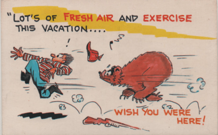 You don’t often see bears on their hind legs on postcards, but they DO spend a lot of time chasing unwary humans. This results both from the ferocity of the angry bear and partly because it was so easy to make puns on “bear”.