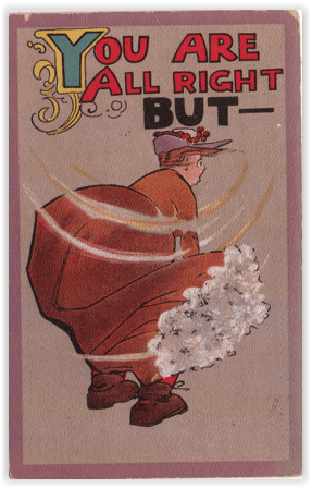 Flipping through my unsold inventory this weekend, I was made aware of something we have not yet covered in this column’s occasional pursuit of the butt in joke history. We have observed that our ancestors in the supposedly prudish era when postcards were born had no particular fear of using this particular four-letter word, IF it could be excused with a pun, as in the postcard seen above.