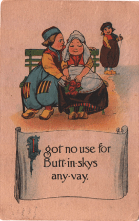 But (and I use that word with some trepidation) I noticed a goodly number of postcards warning us not to “butt in”, and references to some people being “buttinskys”. Several of these were cards featuring the heroes of our Dutch Kids craze, which puts the phrases back to around 1912, but others were cards with undivided backs, which, as you will certainly recall from our sketchy history of postcards in the United States, puts them before 1907.