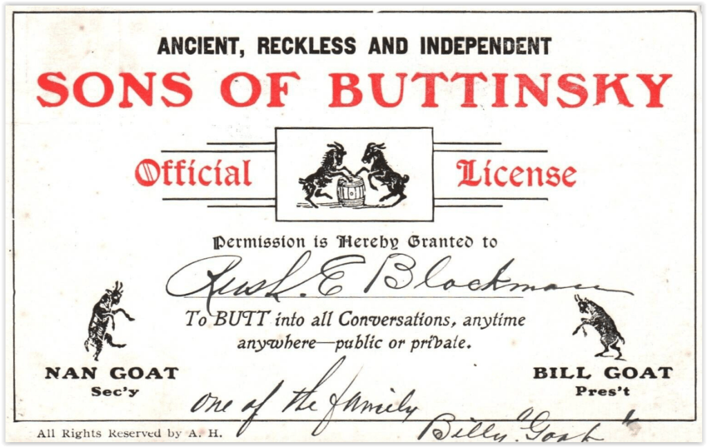 Despite the presence of a number of urban legends out there in the Interwebs, which would have us peruse the savory tale of Polish peasant Stanislaus Buttinski, who was eventually executed (beheaded or burned at the stake, depending on which part of the legend you like) for always butting in with advice at the Polish royal court in the 1680s, thus making his last name a watchword for…never mind. Despite that story, the phrase “buttinsky” was invented in the United States by a newspaperman who combined the OLDER phrase “butt in” with the name form of numerous Russian immigrants. He had someone accused of being a member of “the Buttinski family”.