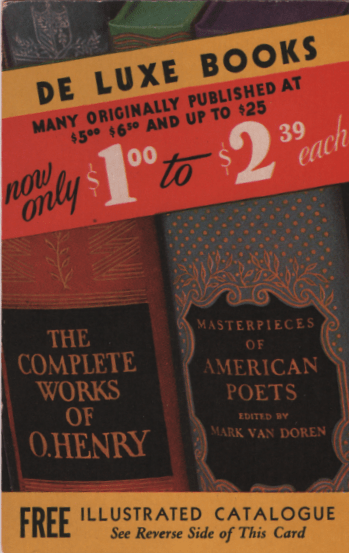 The custom of sending this sort of useful information to prospective buyers goes back to the invention of the post office, basically. Postmasters were allowed to send mail for free as part of their job; companies eagerly sent bulk mailings to these overworked souls and told them to pass these along (all for free) to any customer who might like it. As advertising became bigger and bigger business, the postmasters were cut out, since postage rates were low enough to make it possible to send out millions of postcards duplicating your magazine ads. (I suspect it was the magazines, and not the postcards, which were responsible for the dozen or so copies of each of these books donated to the Book Fair.)