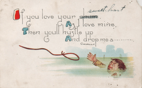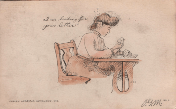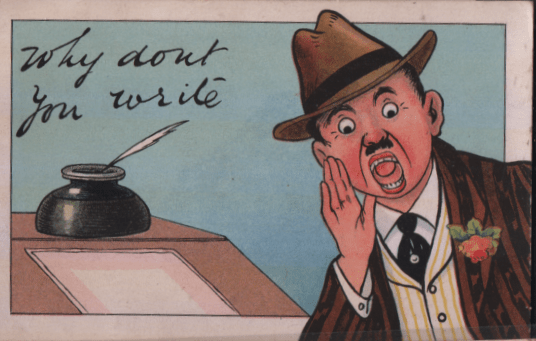The etiquette of the system is intuitional, but even in those days was frequently shuffled aside. The basic rue was “I write you a letter, you write ME a letter.” Sending someone two letters in a row was going above and beyond (this was in a day when a four or five page letter was not unusual, so a lot of work was involved.) Another rule, pertinent to the era of our concern, was “A letter demands a LETTER in return.” The receipt of a mere postcard did not count, which is why the jumble of designs and cartoons on postcards past includes so many “Here’s a card, I’ll REALLY write later” designs. This amounts to an apology for not taking the time to get out paper and an envelope (and it’s fascinating that the postcard industry was right there to supply this need. What other corporations produce products which apologize for their existence?)
