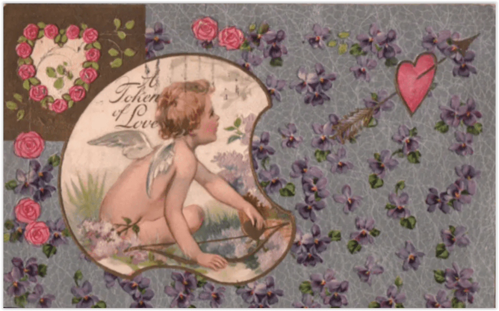 If that seems to be a thoughtless rush to bring out Valentines so people could spend money on them, this idea is not new. This 1907 Valentine is festooned with advertising slogans, emphasizing the profits which could be made by associating products with romance.