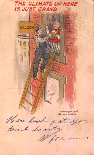 We have several times in this space considered the actions of alcoholic beverages on the people seen on vintage postcards. This alcohol appears in many roles depending on the angle the artist has decided to take: the toast at a banquet, the beer keg in the cellar, those cans and bottles in the fridge, the still up in the hills. But no artist could produce pictures for picture postcards without being able to draw the good old saloon.