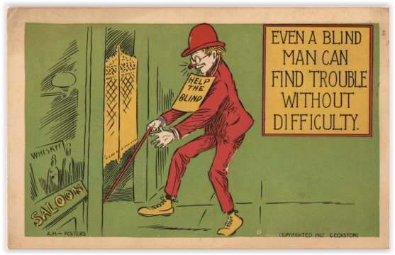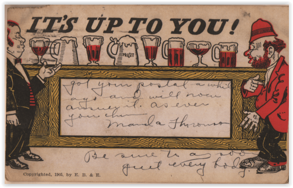 Coming down toward the floor, we find two more articles essential to a postcard saloon. One of these is the cuspidor, or, more vulgarly, the spittoon (there were less pleasant names for it, but we were just discussing food, after all.) The custom of chewing tobacco, at one time apparently nearly universal among Americans (visitors from Europe were always commenting on this), was on the wane, partly because cigarettes had become cheaper and more acceptable socially. But even though tobacco spitting gags were pretty much retired by the time postcards came along (thank goodness), the habit itself never disappeared, and the saloon liked to be known as a place where men could relax and indulge in habits that society (and or wives) didn’t care to see could be indulged. (This also explains all the pin-ups you see tacked to walls in postcard bars, but that’s a whole nother blog.)