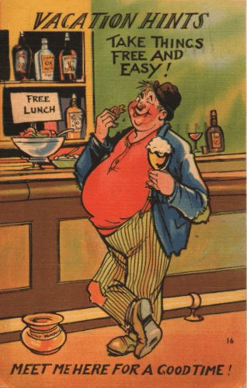 But people who reminisced about the good old saloon were less likely to recall what they drank than what they ate. The “free lunch” was a feature which New Orleans claims as its own invention, but which spread throughout the United States, becoming almost as essential to saloon nostalgia as those swinging doors. This “free lunch” was not free: you had to order a drink before you had access to it (the restrooms worked on the same principle). The pale descendants of the Victorian free lunch can be seen in the bowls of peanuts or pretzels or chips now seen in drinking establishments (often brought to the table AFTER you order.)