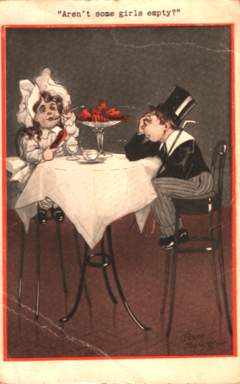 Sometimes, of course, the two are seen in conflict, and a young man learns the lesson of taking his sweetness out to dinner, only to find out how much it costs to feed a relationship. (There are plenty of these postcards, but most deal with the price of champagne and other beverages. The link between romance and booze is a more complex topic, to be treated when we have more time on our hands.)
