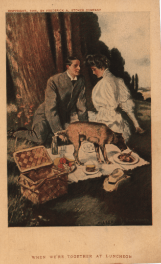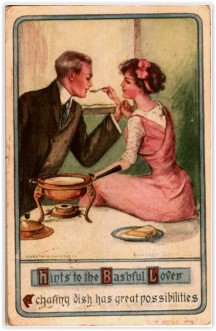 And on occasion, the postcard artists admit that two hearts can be set on fire so thoroughly that they don’t see their food through the resulting smokescreen. (Dorothy L. Sayers covers this in a scene where the hero’s mother, meeting her son’s fiancée, finds her so befuddled by the unexpected proposal that she can’t remember whether she’s eaten anything over the preceding twenty-four hours.) Just because the heart and stomach are close friends, they DO sometimes work at cross purposes.