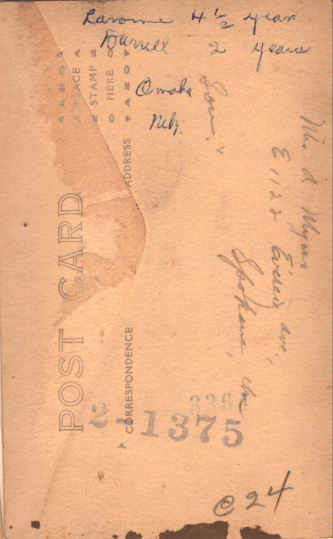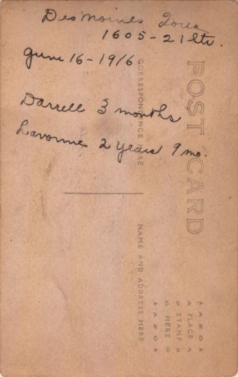 I don’t. Instead I marvel at the accident which saw related postcards survive together to be bought by me. For HERE is Lavonne with her little brother Darrell eight months later. And, once again, useful information has been added at the back.