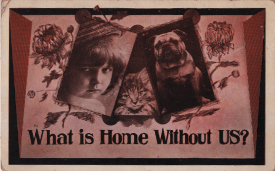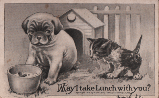 It occurred to me, while cogitating on that ancient feud, that although I have treated of dogs in this space, AND cats, I have never considered the postcards which show both. Those of us who grew up with classic animated cartoons, particularly Tom and Jerry but also the works of Disney, Warner Brothers, and similar artists’ studios, MIGHT assume the majority of dog and cat postcards involve the eternal chase: Dog after Cat (after Mouse.)