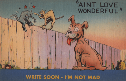 In effect, of course, in the “boy chases girl” teen romance fashion, we DO have dogs chasing cats in these postcards.