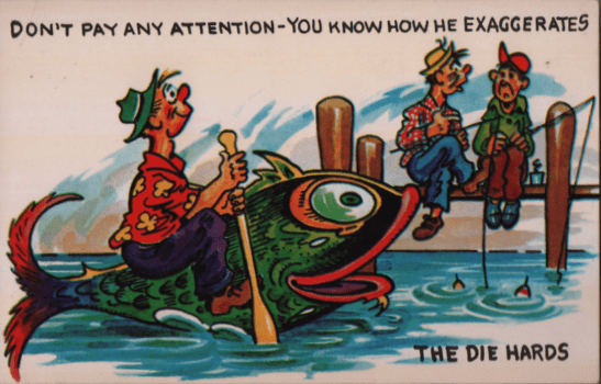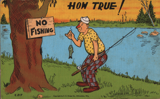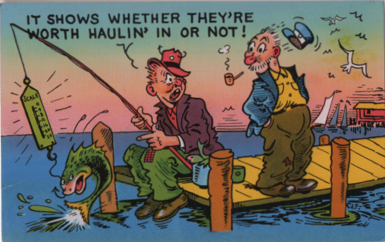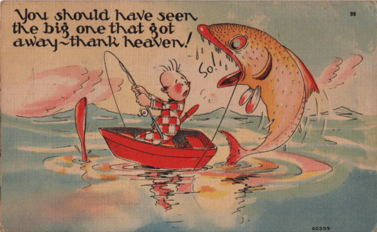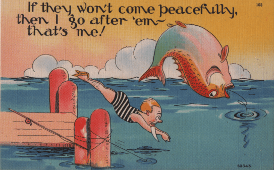 They say a person can learn a lot about life from fishing. This is, as our ancestors said, as may be. I can’t speak to it. I gave up fishing at the ripe old age of eight or so when my excitement at actually catching a fish was dashed when I was told I had to throw it back (it was ALMOST as long as my thumb.) But I WILL say there are life lessons to be learned from looking at POSTCARDS about fishing.