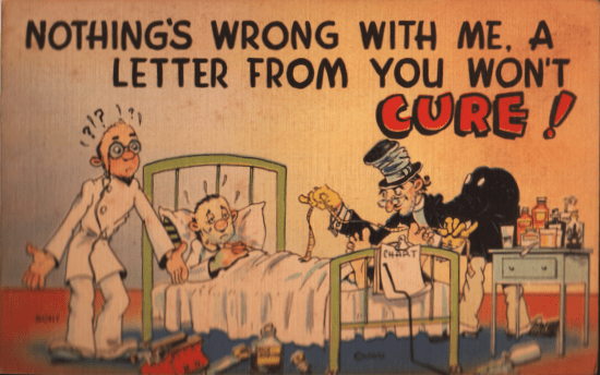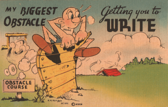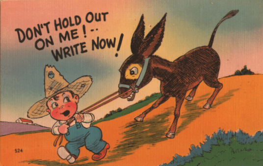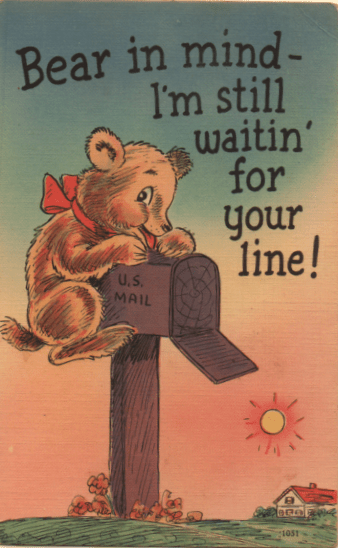 This was an especially easy job when, as with the Valentines, you had the same basic message to push out on dozens of different cards. So it was a natural for the very popular “Why haven’t you written yet?” postcards. This was also a nice break from the Valentine lines because you could draw frowning faces, something that was not considered useful in the grade school Valentine.