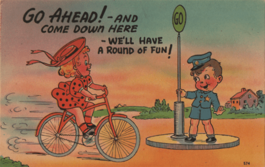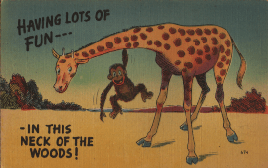 After the lottery comes through and I have the time and money to do all the research, I WILL look up postcard collections in libraries and find out how many of these cards were, in fact, sent by second grade teachers who had gotten out of the classroom long enough for a beach vacation. They may have gravitated to the artistic style they knew best even on an out-of-town skinny-dipping expedition. Don’t wait around: the lottery has not been doing much for me since I suggested some of these postcards would make best-selling Instant Win tickets. I should send another one of those “Why Don’t You Write?” cards to remind them I’m here.