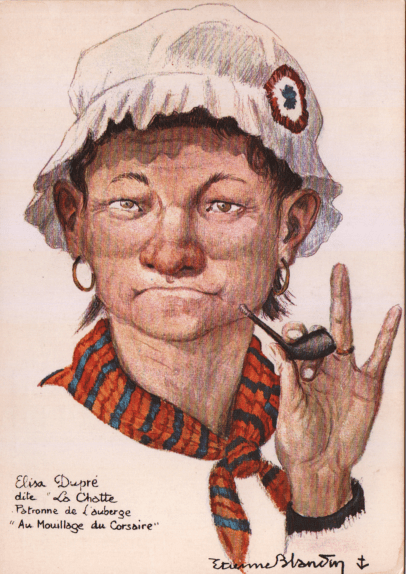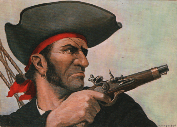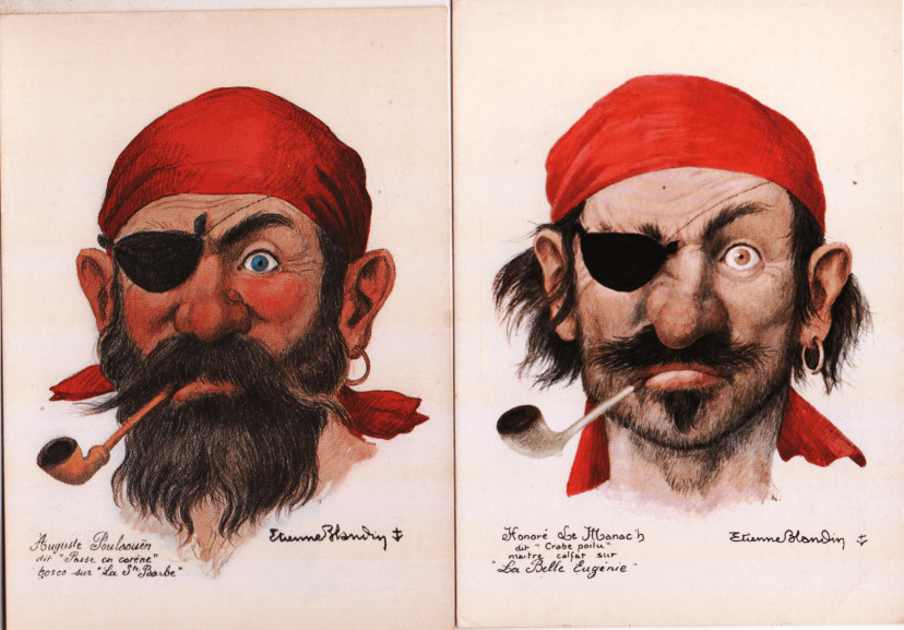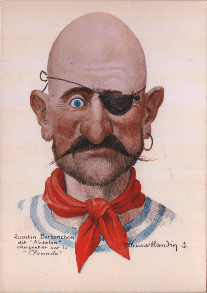Somewhere in the vast world of fans and collectors, there MUST be a guide to his 86 Corsaires which explains when he did these paintings, who decided to make them into postcards, and to what degree each is based on someone he knew personally, or whether all these characters and their wild world sprang straight from his imagination. Nowadays there’d be a graphic novel series, animated cartoons, live action movies and who knows what-all else. (Maybe there were, and nobody on the Interwebs wants us landlubbers getting involved.)