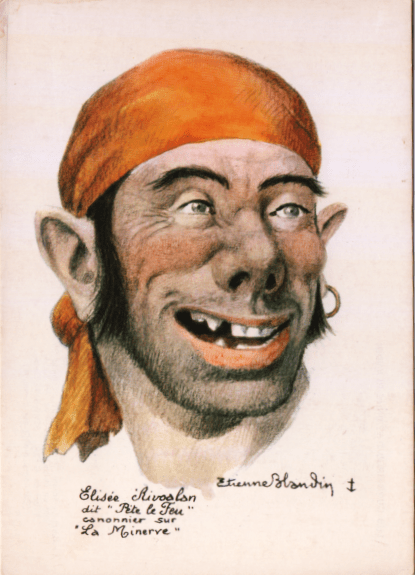There were eighty-six portraits in the full set, each with a name, a nickname (essential for a pi…corsair), and the role they played aboard whatever ship each served. It’s a maritime malefactor trading card set–I was half expecting a table of statistics on the back, with voyages, battles, and loot recorded there. They are individual, colorful, and completely the product of the imagination of artist Etienne Blandin.