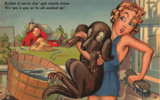 The answer to that last one is simple, really. She’s there to help sell the postcard, rather like the young lady shown here trying to wash her dog. The joke doesn’t have anything to do with WHO is washing the dog, nor how that person should be dressed. But at least she is a part of the gag, unlike the lady in the first postcard. And that rather scanty outfit is practical, as anyone who has washed a large dog will understand.