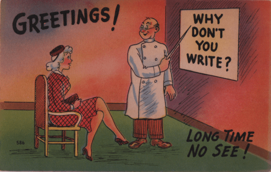 This joke didn’t particularly REQUIRE a woman either, or a very tiny woman (look at her height compared to that of the mailbox and/or newspaper. Of course, this was during World War II, when men overseas were thinking of the “little woman” back home.)