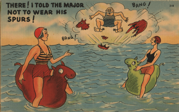 None of these ladies is quite as pointless as the bysitter in the first postcard. Somebody HAD to be around to deliver, and receive, this joke, and since we’re at the beach, why NOT a couple of healthy young women in 1930s bathing costumes?