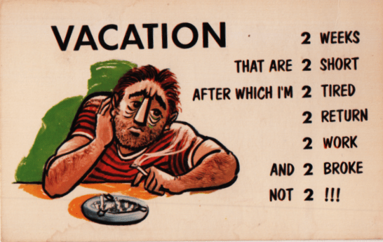 Whether this is an accurate reflection of the strain of moving outside one’s routine and working hard to have fun, or just an expression of guilt at leaving your friends behind in the humdrum reality from which you have escaped, the theme of “Wow, I’m exhausted; wish I was back there mowing the lawn and kicking the air conditioner with the rest of you” is to be found on card after card.