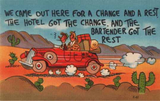 Well, actually, I found just one, seen at the top of this column, and THAT is mostly an ad for the healthy effects of visiting the baths in Hot Springs. There are MANY more postcards about how rotten vacations make you feel.