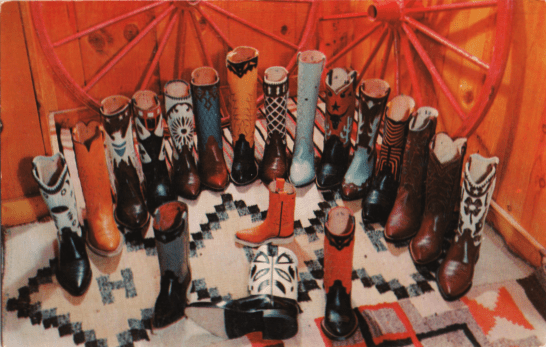 And THAT sort of thing is more or less eternal, as shown in this postcard from about half a century later, featuring an assortment of boots available in Arizona. (I’m sure the boot from the previous postcard is in here somewhere. Keep looking.)
