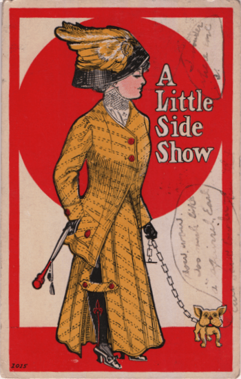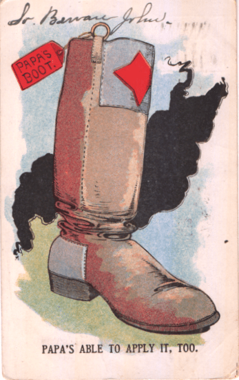 Rather than rail against fickle fate, which has made it impossible to watch this young man’s revelation on the Interwebs (did NO one save a copy?) we will consider the role of shoes on postcards of the past. Our postcard artists were NOT going to let this important article of fashion elude their notice, especially if their point was making fun of a well-dressed man. This chap cannot catch a break from the cartoonist, head to pointed toe.