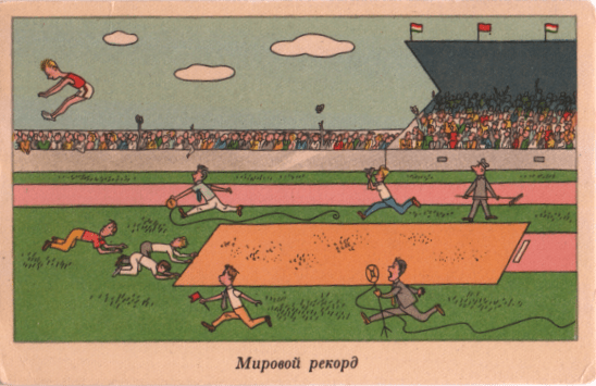 And in some cases, we have illustrations of sports which are no longer part of the Olympic lineup. This lady is demonstrating her skill at the early Biathlon, a combination of weightlifting with stairclimbing. (We do not have time for side issues, but I hope you have observed that some Olympic uniforms were as impractical as some of today’s: how many events nowadays are performed in heels?)