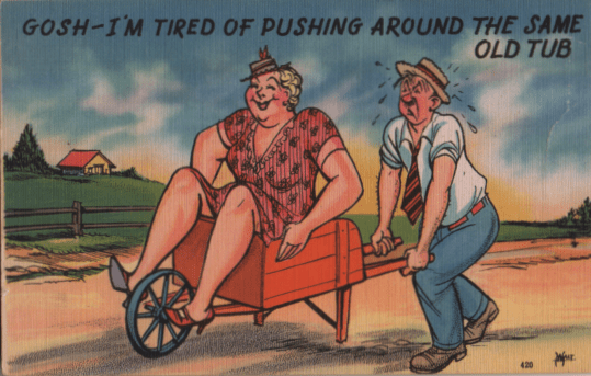 The postcard artists were interested in all forms of athletic endeavor. This may be one of the first pieces of evidence that curling was being considered for the Winter Olympics even before there WAS a Winter Olympics. The lady’s size and her readiness to make use of a broom show she was an enthusiastic curler.
