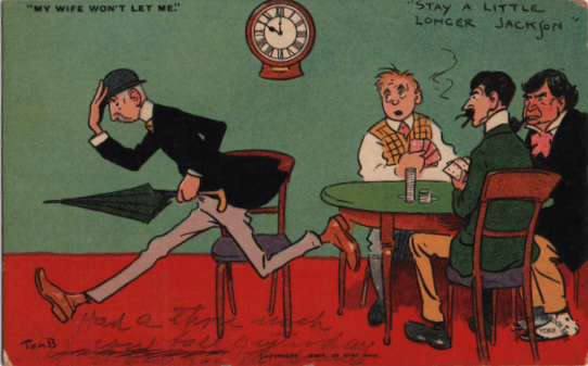 What I wanted to mention was that the array of postcards about married life shows a relation to the Olympics I had not suspected. This British card, for example, shows that the 100-yard dash was well known to cartoonists early in the twentieth century.