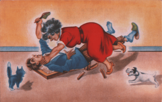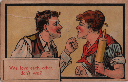 In the world of boxing, this card from 1908 or thereabouts shows that the postcard artists were ahead of their time, envisioning mixed boxing (the female boxer is apparently given an equipment advantage.)