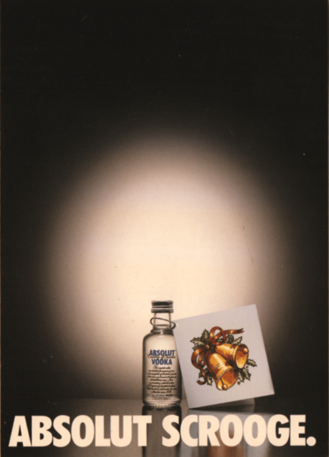These are not all antiques. This comes from one of Absolut’s series of surefire gags around the turn of the current century, usually involving a picture puzzle where you needed to figure out what part of the picture had been made to look like a vodka bottle. But as a Scrooge scholar of minor fame, I must admit the punchline is eluding me. I’m missing whatever reference to Ebenezer they intended. The scene is spooky enough to involve ghosts, I guess, and there IS a Christmas Present.