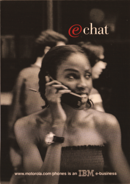 I can’t even tell what this card from the same era is advertising. This may be because I don’t quite recognize that device as a phone, and it may be because phones could not, at that time, send texts or emails. So what makes it “eChat”? Was this the work of minds who also knew very little about the new electronic communications, who just figured anything with an e on the front of it would sell?