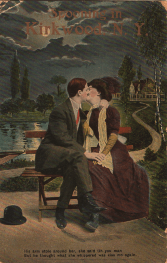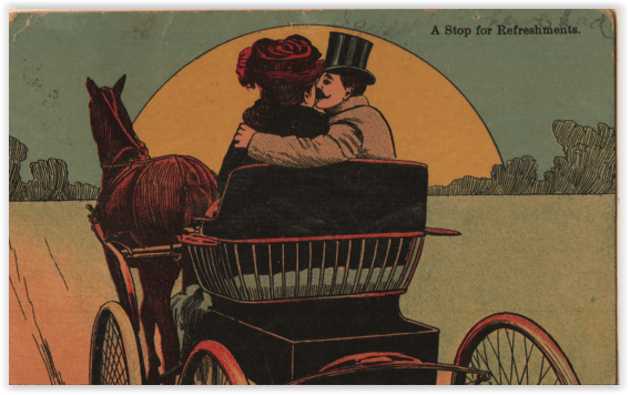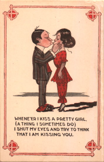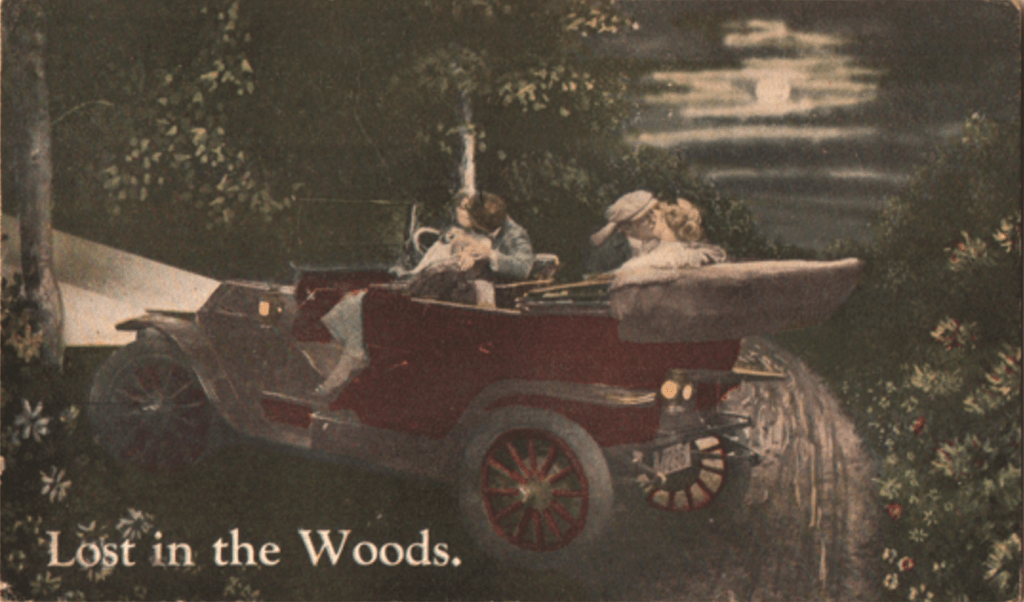 Postcards were never shy about romance, and the artists responsible for the images on postcards knew a great deal about how the course of true love ran never smooth. One of the great obstacles to romance, according to the postcards of old, was not winter, but the difficulty of finding the time, the place, and the opportunity. Even in an age when people did NOT carry a camera around in their pockets, the possibility of a private place for a quiet cuddle was slender, and excuses had to be found. Here, for example, we have a couple of couples who have ventured WAY too far from the roadway, and have become so lost in the depths of the dark forest that their only choice is to huddle together for warmth, and wait for a glimmer of light to break through the surrounding gloom. (That car hasn’t even pulled off onto a shoulder…but it’s the only one.)