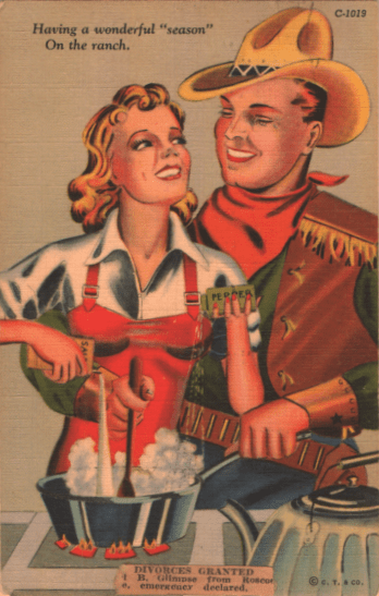 There are not nearly so many postcards discussing what happens when two people manage to slip off to the kitchen to heat something up, but they do exist, this cowboy cuisine version being one of the most recent examples. (I admit to some curiosity about what they’ll be enjoying later, but the way they’re cooking, it won’t be what’s in that pot.)