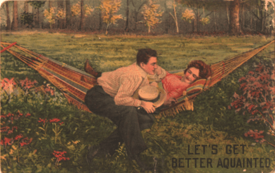 A hammock is always a good excuse, once you master the art of defying gravity. We also did a blog on how these provided an excuse for sitting close, since they sag toward the middle, pushing two occupants together. And the best ones had enough cloth in them so that anyone who decided to lie down in one caused gravity to bring the sides up, hiding the occupant(s).