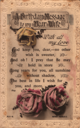 This is a little more flowery (so to speak), and really a little easier to read because of that. This is the only postcard in this article which was actually messaged: a man wrote a two-line message endorsing the front of the card, and handed it to his wife (whom he addresses in the message as “Wife”.)