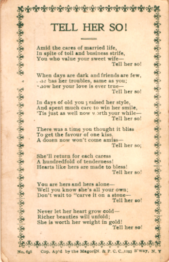 We have discussed hereintofore the habit of a generation or two around the turn of the last century for what I call “refrain” poems, where a sentiment is hammered in by putting it at the end of every stanza. (I’ll look into whether or not these were all inspired by the best-selling poem “Excelsior”, but that’s a whole nother blog.) Telling other people how to treat their spouses, however, has no specific age in history, and I am not sure this doesn’t do the job better than some 300-page how to books on the same subject. (On the other hand, the song “Little Things Mean a Lot” covers the same territory, and has a melody.)