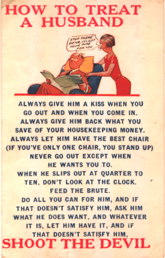 It should be understood that there were plenty of postcards as well about how to treat your husband. This is a British contribution to the literature of interpersonal relations.