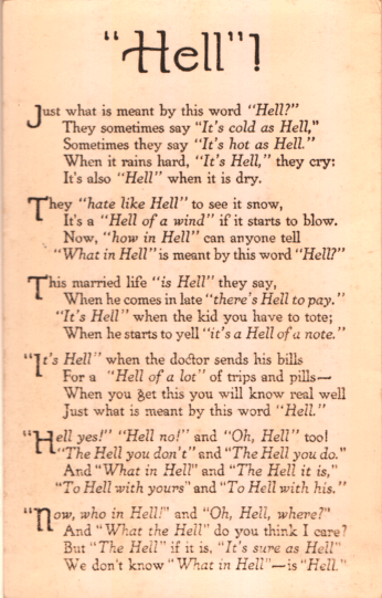 How this got into the collection I hesitate to ponder. But I like its attitude and I admire its courage, since it bears all the marks of a card published somewhere around 1912, when, I was always taught, Americans minded their language in public. (I have also read that we simply became more mealy-mouthed somewhere around 1929.) I started rewriting this text in my head, substituting other words. But the result would be merely derivative, larcenous, and unpublishable. Consider your own version…AFTER you decide why this was part of the matrimonial postcard collection.