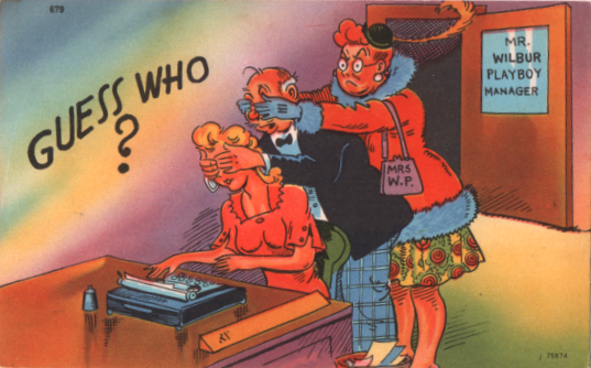 Last week in this space, we considered a couple of the cartoon side effects of marriage: fighting about money and carrying groceries. In checking my inventory of fascinating but somehow not yet sold postcards, I find another popular cliché about the married man, especially, the married man of business: the suspicion that his work at the office came with certain benefits not mentioned to wifey at home.
