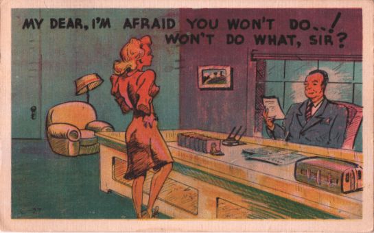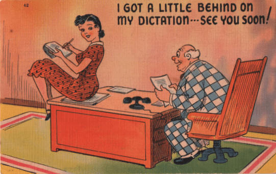 A big part of this cliché, though you have observed it is not universal, is that the businessman taking advantage of that private office is a good deal older than the secretary involved. Neither this, nor the basic premise, are limited to mid-century jokers. These were established at least as early as 1908, when this joke was mailed.