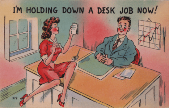 And who’s crazy about their position here? Our businessman seems more pleased at how well chair and secretary seem to be made for his satisfaction. (More snickering. Okay. Have you heard the one about a scholarly speaker explaining how 1930s businessmen in Chiago took advantage of their authority? The speaker noted that the president of a major museum “naturally created a position for his mistress.” When the audience laughed, he spluttered a bit and said, “Oh, you know what I mean: he found a place for her on his staff.”)