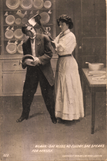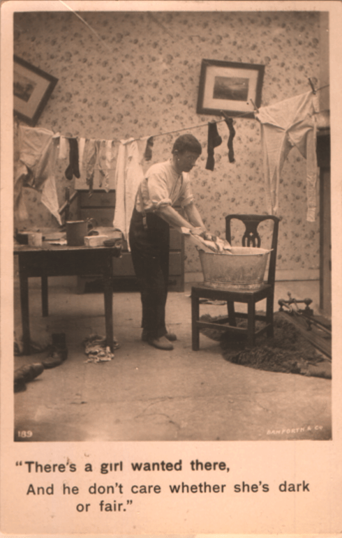 Even as a child, though, I resented all the folktales which suggested that if men and women switched jobs, the women would do perfectly fine while the men would be lost at the outset and and be nothing but a puddle of muddle by lunchtime. And the majority of fine old postcards follow this trend. Laundry, especially, was considered a suitable reason for getting married.